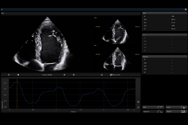 - Auto EF automatically traces the endocardium during systole and diastole cycle and calculates the EDV and ESV to output an accurate EF result.