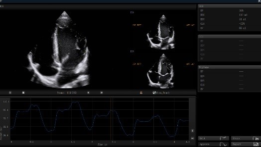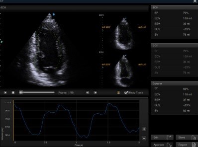 Cardiac function evaluation requires accuracy and speed as various calculation needs to be made. Auto EF, based on speckle tracking technology, acquire 2D EF and volumes within streamline workflow.